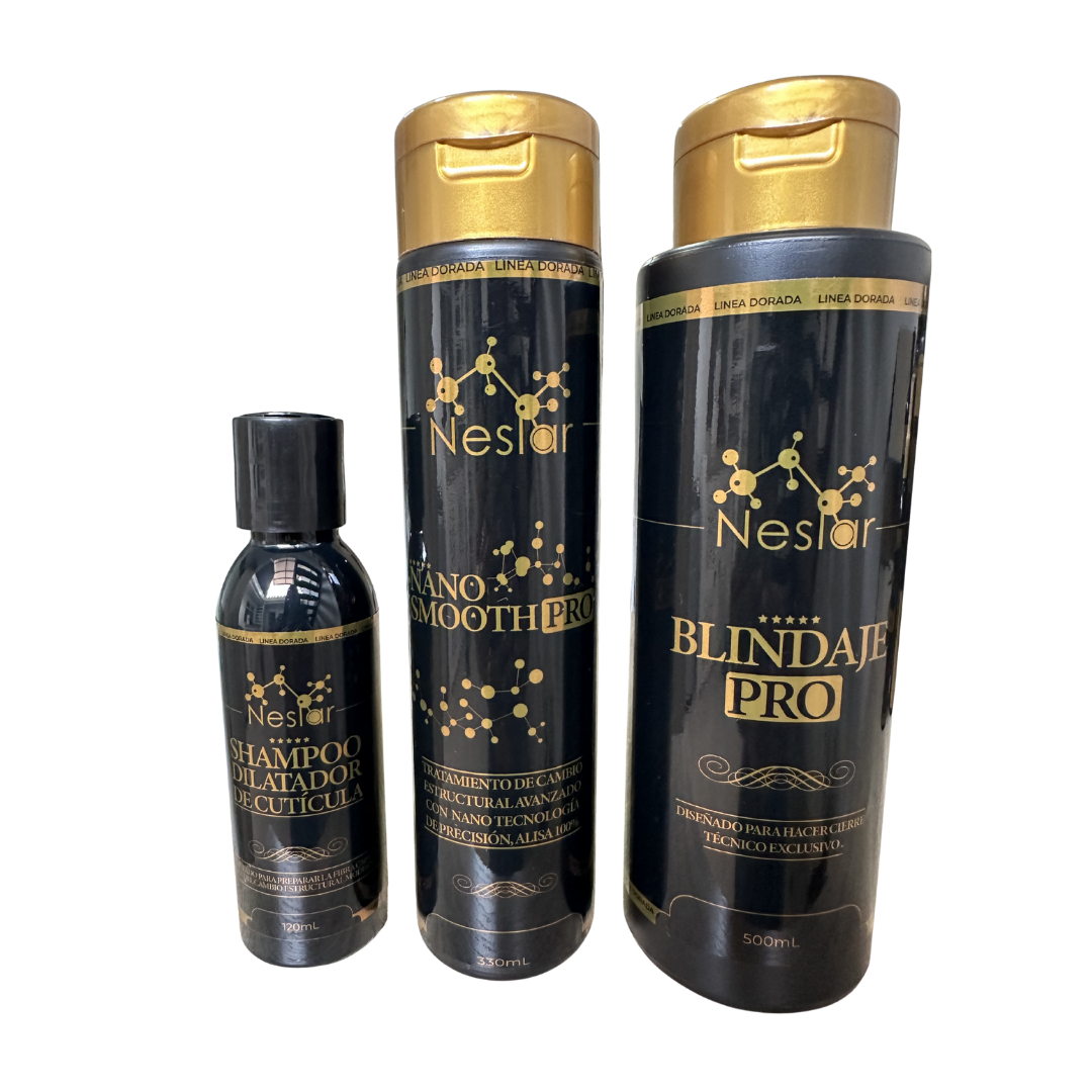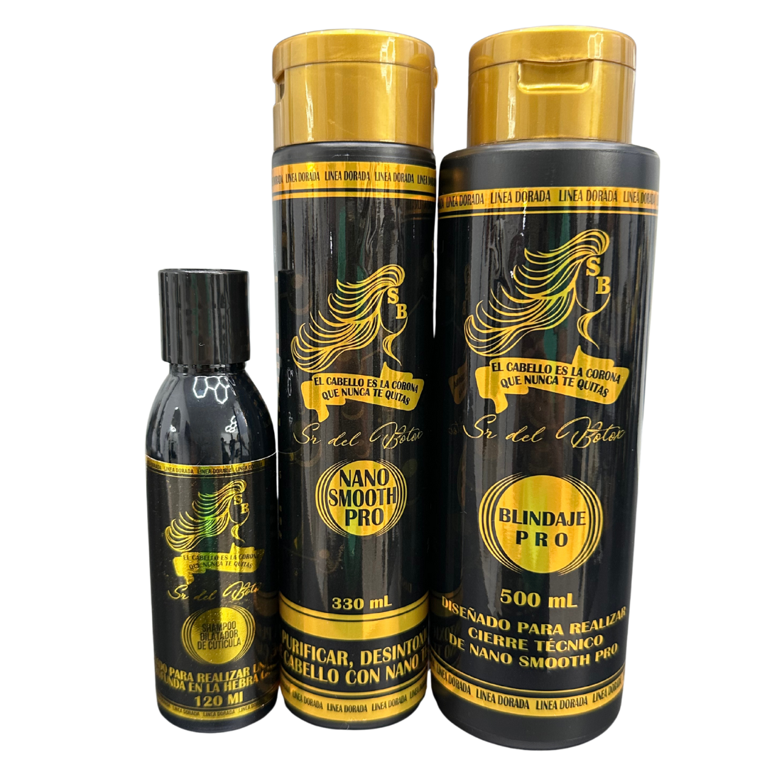 330 ML de Nano smooth pro – 120 ML de shampoo dilatador de cutícula – 500 ML de mascarilla blindaje pro.